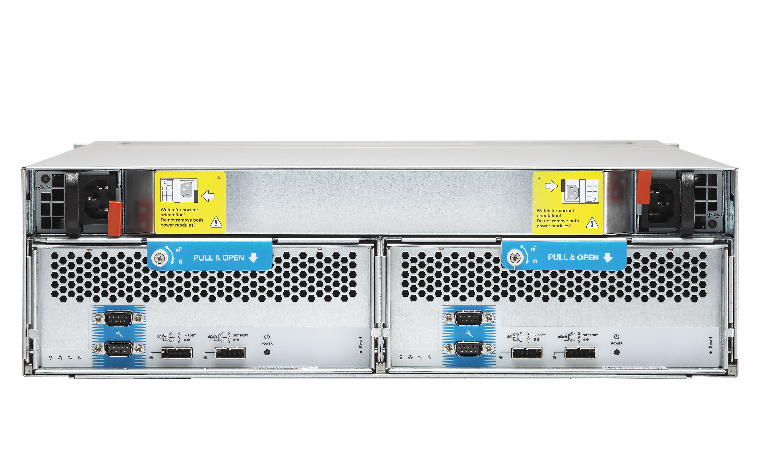 The EJ1600 supports 16 hard drives and 128TB raw capacity in 3U rack space. The EJ1600 has two SAS wide ports (IN and OUT ports) for each controller (with 4 SAS wide ports in total with dual controllers) for host connectivity and daisy-chaining respectively. Each SAS wide port combines four SAS channels, with each supporting 6 Gbps full duplex speed. The solution delivers unprecedented performance of up to 24 Gbps per host connection.