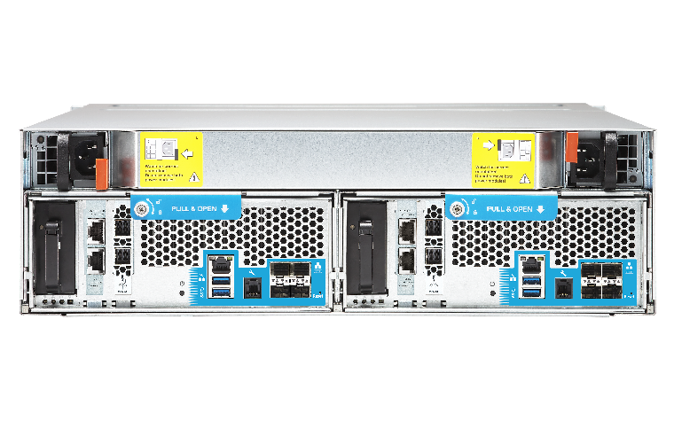 - Dual active controllers, NVRAM cache, dual mini-SAS channel backup, 40GbE-ready, SAS 12Gb/s-enabled