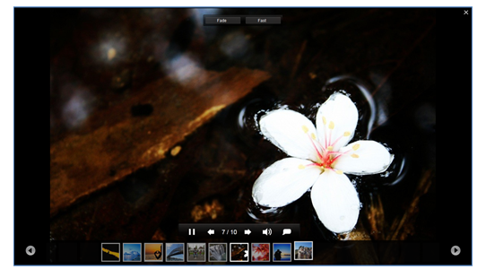View the photos by slideshow with dazzling transition effects. Turn on the background music to add more fun while enjoying the photos. The offerings of thumbnails and photo title display presented with the slideshow enable you to preview the photos ahead.