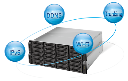 QNAP Turbo NAS provides numerous functions for network settings. The support of DDNS, IPv6, multiple LAN and wireless LAN facilitates the Turbo NAS operation for IT administrators in terms of convenience and ease of use.
