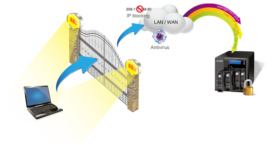 QNAP Turbo NAS supports numerous functions to provide security for system, data access, and stored files. The encrypted access protects system connections and communications, the IP blocking helps prevent suspicious users, and the external drive encryption reduces the risk of data stealing in case of thief of hard drives. Moreover, detection against the latest viruses is supported. All these measures aim to make the Turbo NAS a safe place for important files.