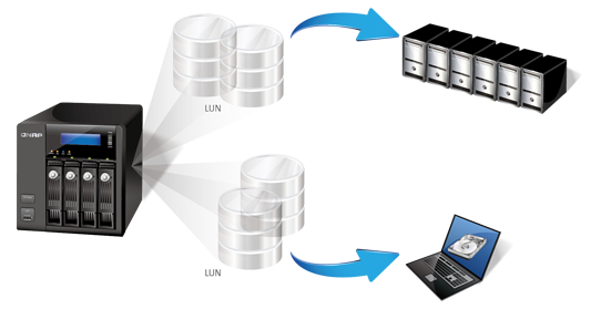 As an iSCSI/IP-SAN storage solution, the Turbo NAS is capable of sharing storage capacity for multiple iSCSI targets and iSCSI LUNs over the network. It enables businesses to optimize the usage of storage capacity with disparate users within the organizations, preventing numerous storages dedicated to each user but left unused most of the time and further lowering the total cost of ownership (TCO). The Turbo NAS supports multiple LUNs mapping per iSCSI target. The LUNs can be flexibly mapped to, unmapped from, and switched among different iSCSI targets.
