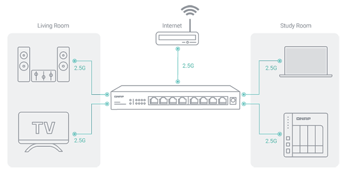 | A switch that supports 2.5GbE+ | QNAP 2.5GbE switches support 2.5G/1G/100M and allow connecting multiple workstations and devices for high-speed collaboration in device-dense environments. |