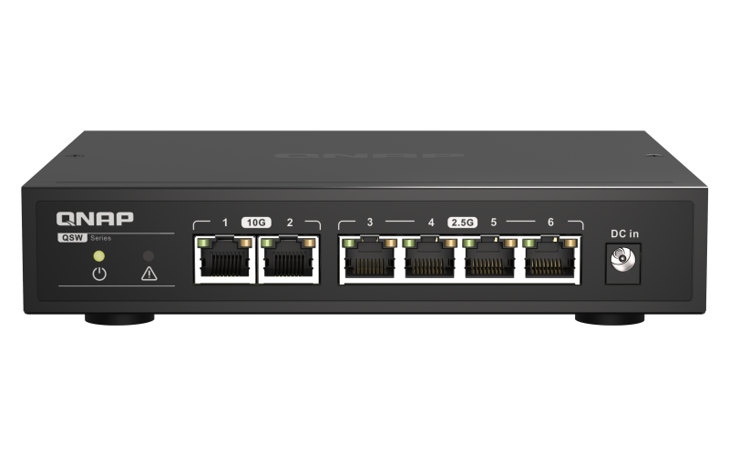The QSW-2104-2T is an easy-toe unmanaged switch with 2-port 10GbE RJ45 and 4-port 2.5GbE RJ45, allowing you to upgrade your network environment by connecting a wider range of devices with different bandwidth requirements. Featuring a near-silent fanless design and compliance with IEEE 802.3az (Energy Efficient Ethernet, EEE), the QSW-2104-2T operates quietly and with optimal power usage. With high performance and superb functionality, the QSW-2104-2T is the ideal choice for creating an affordable high-speed network environment in your home or workplace.