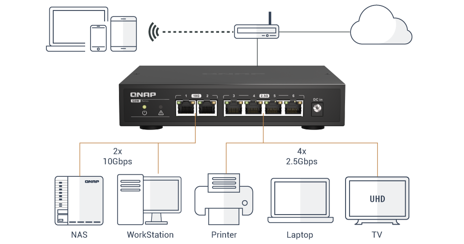 The QSW-2104-2T features 10GbE and 2.5GbE RJ45 ports for connecting various bandwidth-demanding devices, and supports the NBASE-T™ standard for connection using Cat 5e or Cat 6a cabling. With the QSW-2104-2T, you can easily create a hybrid high-speed network in homes and offices to accelerate file transfer, virtual machine applications, multimedia streaming/sharing, and more.