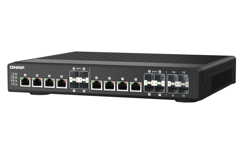 The 12-port QSW-IM1200-8C switch includes four SFP+ (fiber) ports, and eight SFP+/RJ45 (copper) combo ports for connecting different interfaces. With RJ45 interfaces, 10GbE is supported using Cat 6a (or above) cables. Direct Attach Copper (DAC) cables can be used with SFP+ ports for connecting to servers inside a rack. The switching capacity of the QSW-M1208-8C is 240 Gbps, guaranteeing the full potential of each port. The QSW-IM1200-8C is also compatible with 10GbE and NBASE-T technologies to support up to five speeds (10G / 5G / 2.5G / 1G / 100M). The SFP+/RJ45 (copper) combo ports provide higher transmission speeds with existing cables. Depending on cable types and their lengths, different speeds can be achieved for faster, more efficient data transfer.