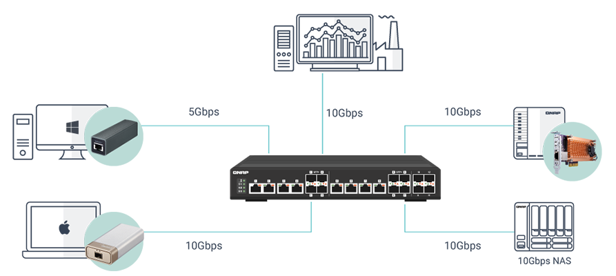 From NAS with built-in 10GbE SFP+ and 10GBASE-T ports, or NAS with PCIe slots that support 10GbE network adapters, QNAP has led the industry in 10GbE adoption. Other high-speed network solutions from QNAP include Thunderbolt 3 to 10GbE Network Adapters and USB 3.2 Gen 1 to 5GbE Network Adapters for Mac®, Windows® or Industrial computers (IPC). These can all be used with the QSW-IM1200-8C to boost the performance of virtualization, surveillance, 3D printing, large-file data transfers, and other bandwidth-demanding tasks in industrial high-speed network environments.