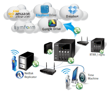 Netbak Replicator is the license-free backup software which allows you to back up your files in multiple Window client PCs in schedule or real time. You can also gain a disaster recovery solution with our RTRR (Real Time Remote Replication) feature by replicating data in multiple shared folders from one NAS to another NAS over the network to ensure the safety of your important data. Besides, the data can also be backed up to another FTP server, external disk, or to online cloud storage services.