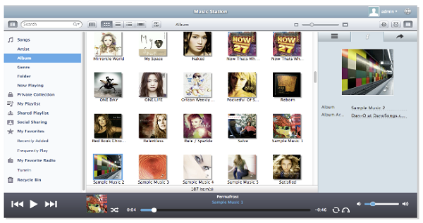The Music Station helps categorize your music collection, and displays album covers to easily organize your personal playlists. Through the music station web player, you can enjoy your music anywhere, anytime with a few clicks. Thousands of local and global online Internet radio programs are built-into Music Station for you to enjoy.