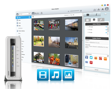 Many applications on the TS-112P are designed with friendly options allowing you to share and connect with your social media communities. When you use Photo Station, or Video Station, you can pick and share photos and video links directly to your Facebook. DJ Station allows you to stream and share your music playlist with your friends and family on your social media platforms.