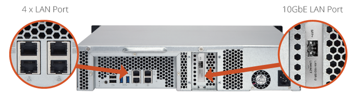 | Ports | 4 Gigabit LAN Ports 1 1 x SFP+ 10GbE 1 (pre-installed SFP+ NIC) Expansion Slot (PCI-E) 2 USB 2.0 2 USB 3.0 |