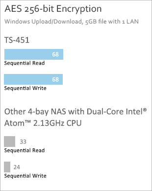Powered by a new 22nm 64-bit dual-core Intel® Celeron® 2.41GHz processor with 1GB energy-efficient DDR3L RAM (upgradable up to 8GB), coupled with the support of dual LAN ports and HDMI connectivity, the TS-451 is a powerful home NAS with supreme value and great performance to deliver up to 220MB/s read & write speeds. The TS-451 can also automatically increase the processor's clock rate from 2.41GHz to 2.58GHz when needed for CPU-intensive tasks. The TS-451’s fast encryption and decryption performance provides transfer speeds of up to 68MB/s with AES-256 bit volume encryption, boosting system performance & security while ensuring the safety of sensitive personal data stored in the TS-451. When installed with the latest dual-band 2.4GHz/5GHz 802.11ac Wi-Fi network card, the TS-451 can offer remarkably high speeds for transferring large amount of files and streaming bandwidth-consuming multimedia.