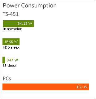 The TS-451 utilizes a 22nm CPU and DDR3L RAM which feature low voltage, low power consumption, maintaining high performance in system operations with the benefit of energy-saving. Other eco-friendly designs include S3 sleep mode, HDD standby, scheduled power on/off, hard disk standby mode, and Wake on LAN.