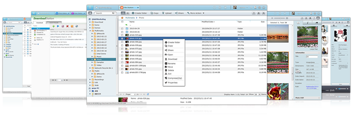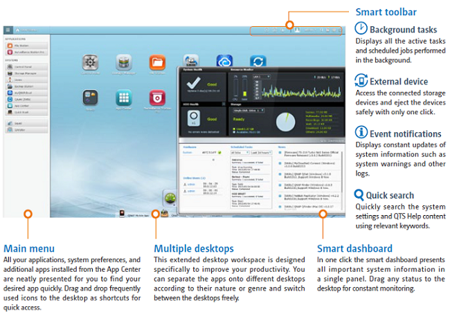 The QTS 4.0’s intelligent desktop offers an intuitive, sleek, and easy-to-follow graphical user interface, simplifying the whole Turbo NAS experience. It allows you to open multiple application windows and run multiple tasks simultaneously. Application windows can be minimized to the toolbar which allows you to see an overview of the opened applications and switch among the running applications.