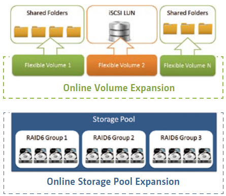 The TS-651 offers a high performance yet affordable storage solution to fulfill the needs of small/home offices in archiving rapidly growing data & large files. The TS-651 supports online capacity expansion by connecting a QNAP expansion enclosure. With the QNAP scale-up solution, the raw storage capacity can be expanded on demand, making the TS-651 an ideal file center with large storage capacity for personal video collections. When connecting the TS-651 to a UX-series expansion enclosure you will have to create a separate volume, and the total usable storage capacity is the volume on the TS-651 plus the volume on the UX-series expansion enclosure.