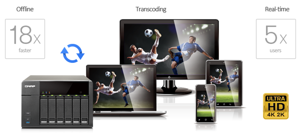 The TS-651 delivers superior real-time Full HD video transcoding to convert your videos to formats that can be smoothly played on PCs, mobile devices and Smart TVs. It allows for up to 5 devices to simultaneously view different videos stored on the TS-651 with on-the-fly hardware accelerated transcoding. The TS-651 allows you to enjoy instant videos on multiple devices - even those that lack computing power or have limited file format support - without the need for complicated and time-consuming file conversion.
