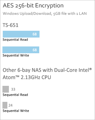 Powered by a new 22nm 64-bit dual-core Intel® Celeron® 2.41GHz processor with 1GB energy-efficient DDR3L RAM (upgradable up to 8GB), coupled with the support of dual LAN ports and HDMI connectivity, the TS-651 is a powerful home NAS with supreme value and great performance to deliver up to 220MB/s read & write speeds. The TS-651 can also automatically increase the processor's clock rate from 2.41GHz to 2.58GHz when needed for CPU-intensive tasks. The TS-651’s fast encryption and decryption performance provides transfer speeds of up to 68MB/s with AES-256 bit volume encryption, boosting system performance & security while ensuring the safety of sensitive personal data stored in the TS-651. When installed with the latest dual-band 2.4GHz/5GHz 802.11ac Wi-Fi network card, the TS-651 can offer remarkably high speeds for transferring large amount of files and streaming bandwidth-consuming multimedia.