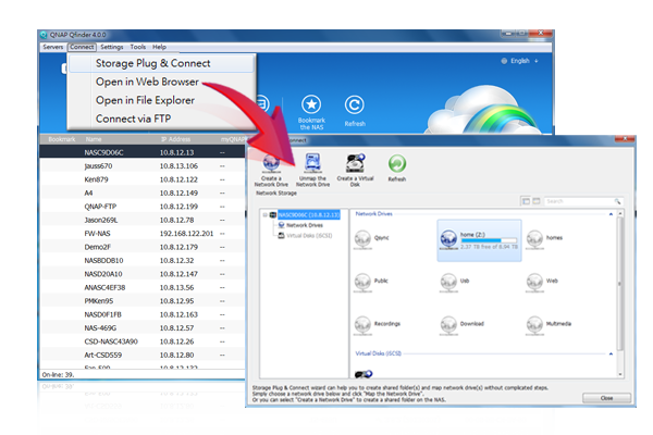 Windows version of Qfinder provides a convenient way to connect to the Turbo NAS and map a network drive or a virtual disk. By creating a shared folder on the Turbo NAS and mapping it as a network drive, you can use it as an additional drive and store files on it as it is a local drive of the computer.
