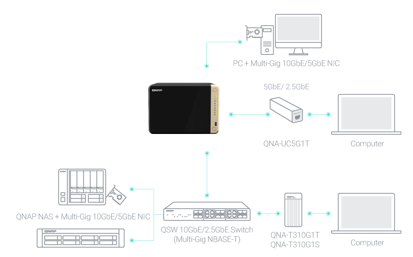 The TS-664 is ideally matched with QNAP’s managed and unmanaged 2.5GbE/10GbE switches to form high-speed, secure, and scalable network environments without going over budget. QNAP also provide 2.5GbE/5GbE/10GbE PCIe cards and USB 5GbE adapters for Windows®/Linux® workstations, allowing you to easily build a high-speed network environment for productive team collaboration.