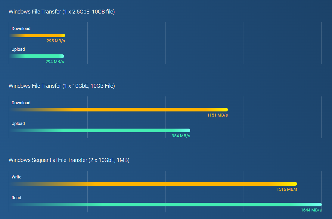 The TS-664 comes with two 2.5GbE RJ45 (2.5G/1G/100M) LAN ports that allow you to use existing CAT5e cables to upgrade network speeds from 1 Gigabit to 2.5 Gigabit. The dual 2.5GbE ports also support Port Trunking for up to 5 Gbps transmission speeds, improving the efficiency of bandwidth-hungry business applications such as large file transfers, fast backup/restore, and multimedia transfer & editing.