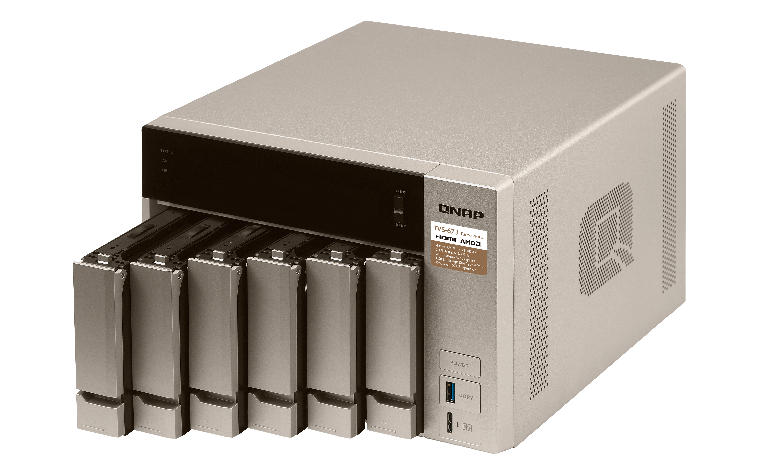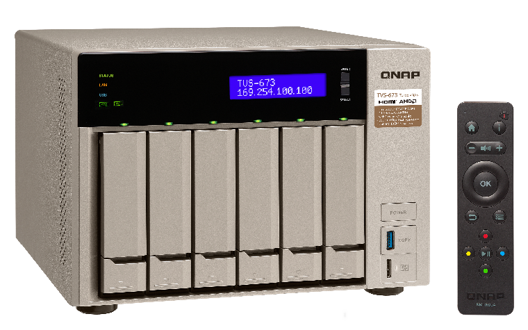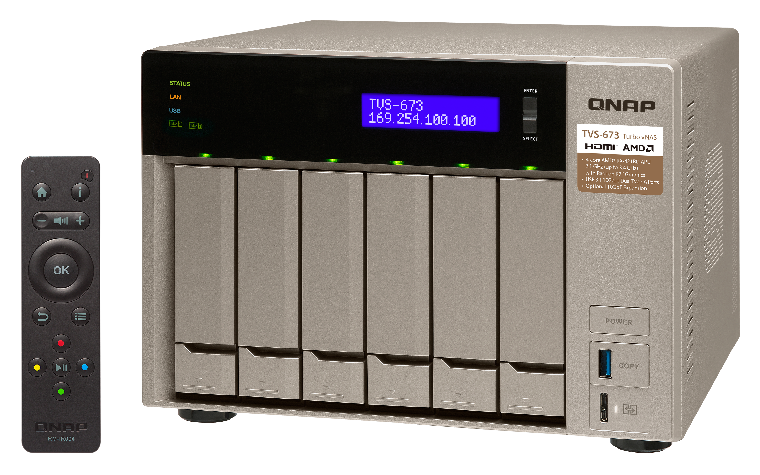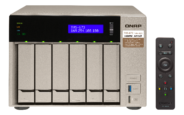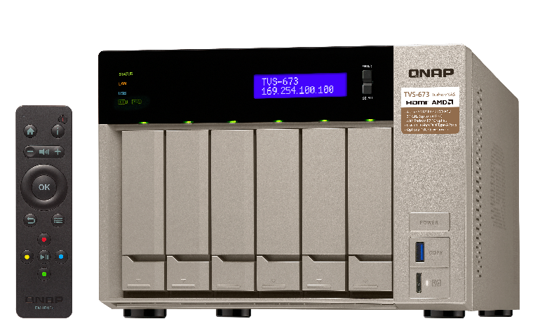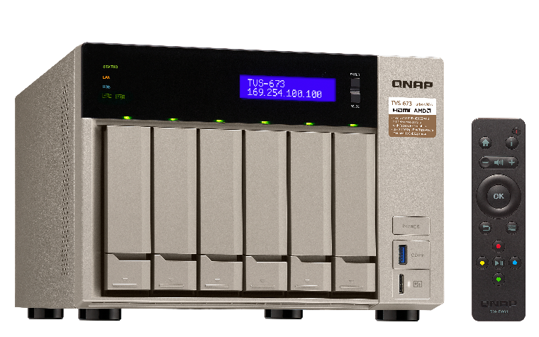 The TVS-673 is powered by an AMD embedded Accelerated Processing Unit (APU) that incorporates exceptional CPU and AMD Radeon™ R7 Graphics performance, delivering a high-performance and energy-efficient NAS solution. Built with a state-of-the-art metal design and topped off with a stylish gold finish, the TVS-673 features a powerful quad-core CPU, AES-NI hardware encryption engine, up to 64GB RAM, USB 3.1 (10Gbps) and 10GbE expandability with exceptional performance. Coupled with the unique USB QuickAccess, HDMI 4K output, and 4K H.264 video decoding and encoding acceleration, the TVS-673 running on the new 64-bit QTS 4.3 operating system provides an optimum audiovisual experience and well-rounded private cloud system.