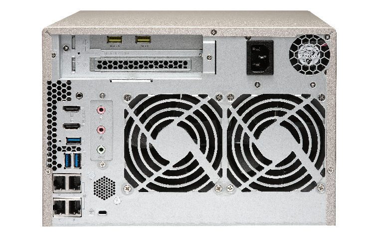 The TVS-673 features two PCIe (Gen.3 x4) slots, one preinstalled with a USB 3.1 Type-A dual-port card, and the other allows for installing an optional dual-port 10GbE (10GBASE-T or SFP+) network card. This allows for greater flexibility in setting up 10GbE environments for high-performance virtualization and backup tasks.