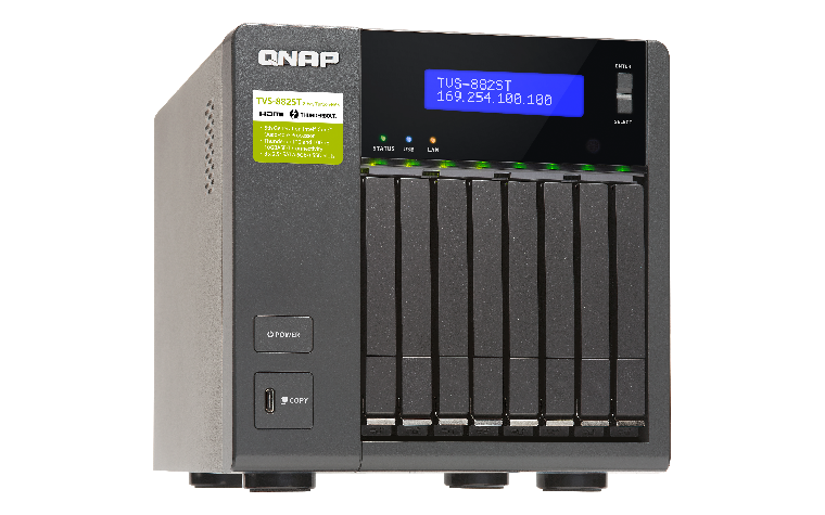 The TVS-882ST2 is powered by an Intel® 6th Generation Core™ i5 Quad-core processor with AES-NI hardware encryption and provides a Thunderbolt™ 2/NAS/iSCSI SAN triple solution. With Thunderbolt™ 2, 10GbE, USB 3.1 Type-C + Type-A 10Gbps, and 4K output it provides the performance and connectivity to empower small offices and studios to take their business to the next level. The software-based Thunderbolt-to-Ethernet (T2E) function also allows Thunderbolt-enabled computers to access Ethernet networks by connecting them to the TVS-882ST2.