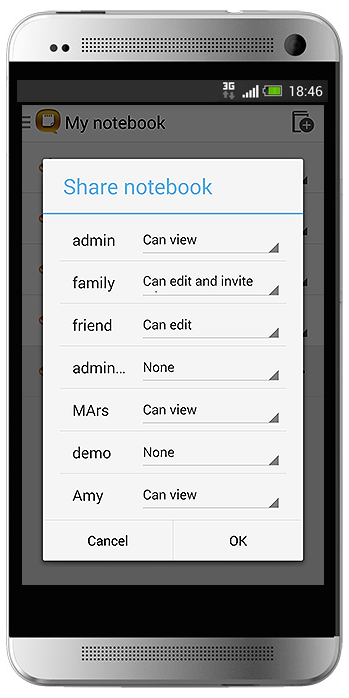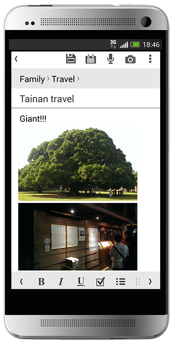 Insert photos, audio, and videos saved on your mobile device (or from its camera and inserted SD card) into your notes to enrich the contents.